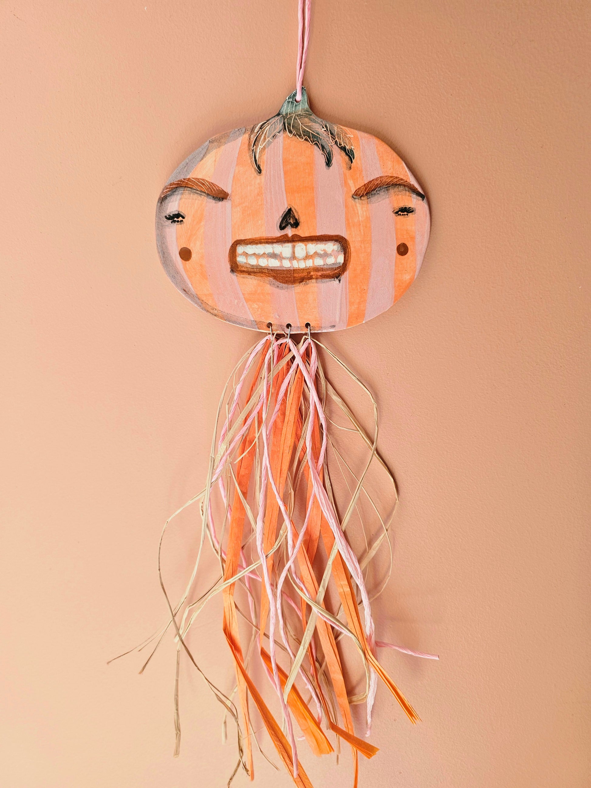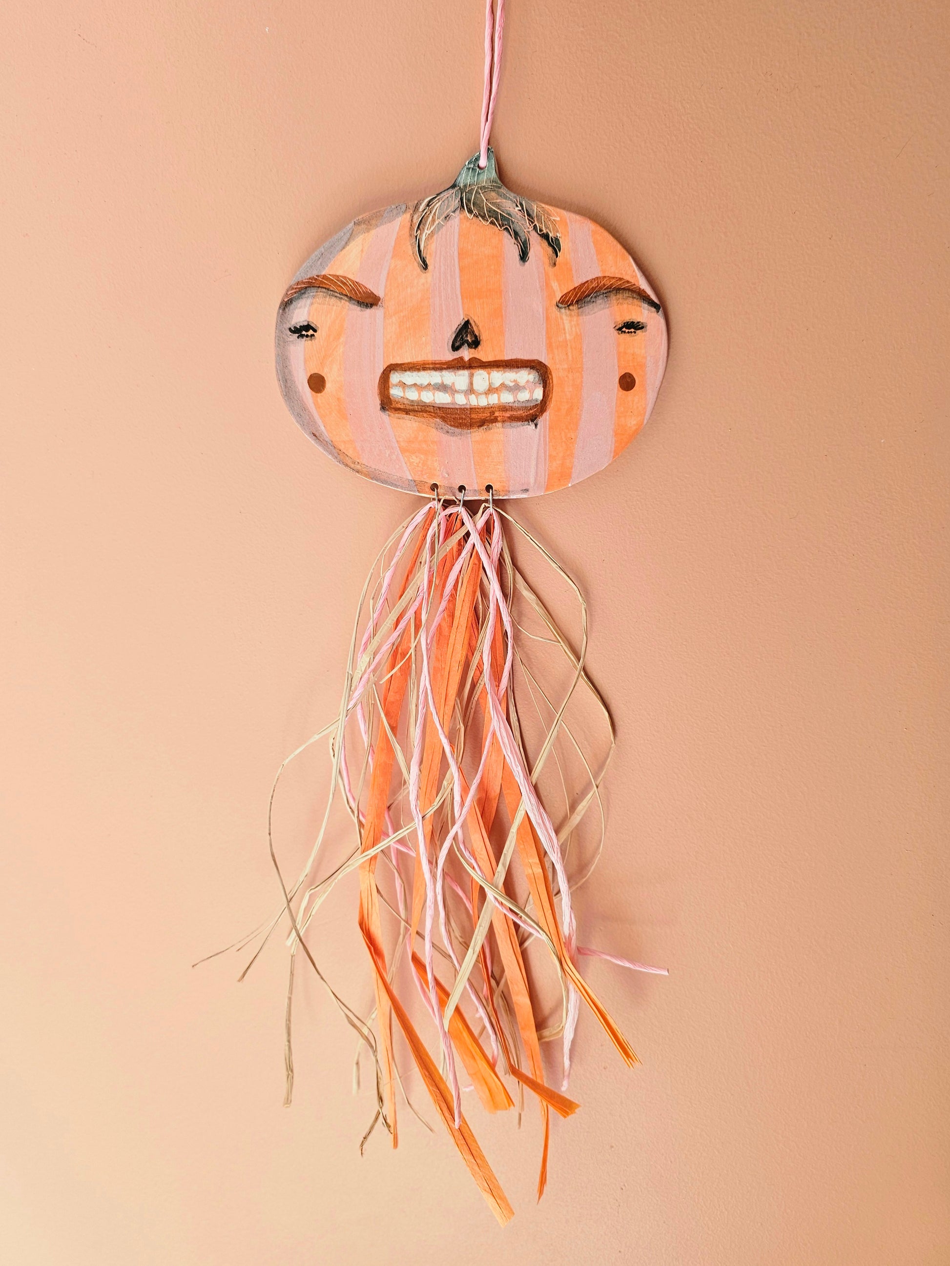 Handmade and hand-painted in ceramic, each pumpkin head is full of personality and charm. Hang her in your doorway, window, or mantel, and let Grinny Ginnie spread spooky cheer (and a little harmless mischief) wherever she dangles.