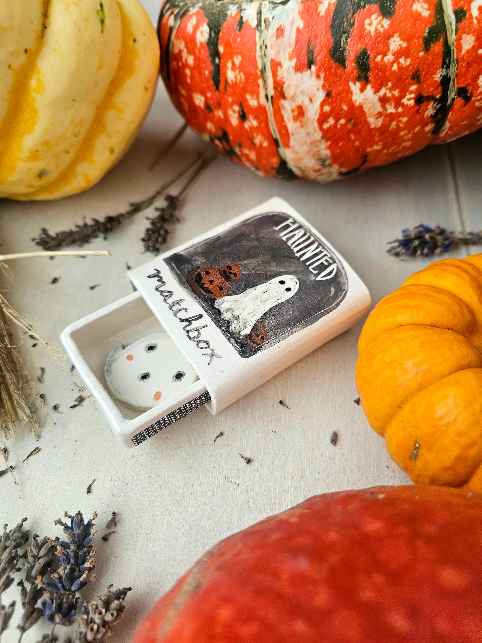Handmade and hand-painted in ceramic, every matchbox is unique, and the little ghost inside is full of personality—part spooky, part whimsical, and entirely irresistible. Perfect as a Halloween keepsake, a little shelf companion, or a quirky gift for anyone who loves a touch of mischief.