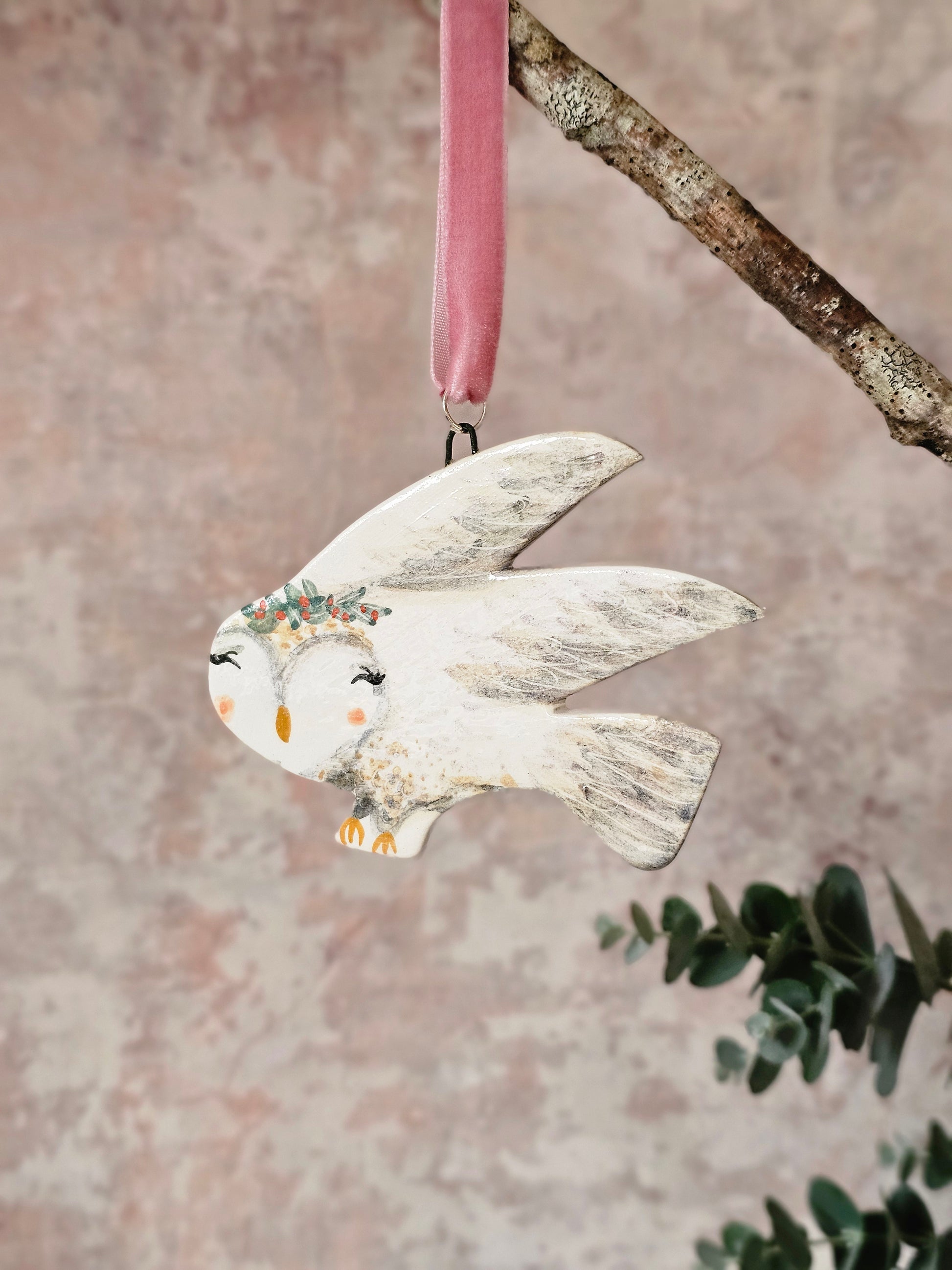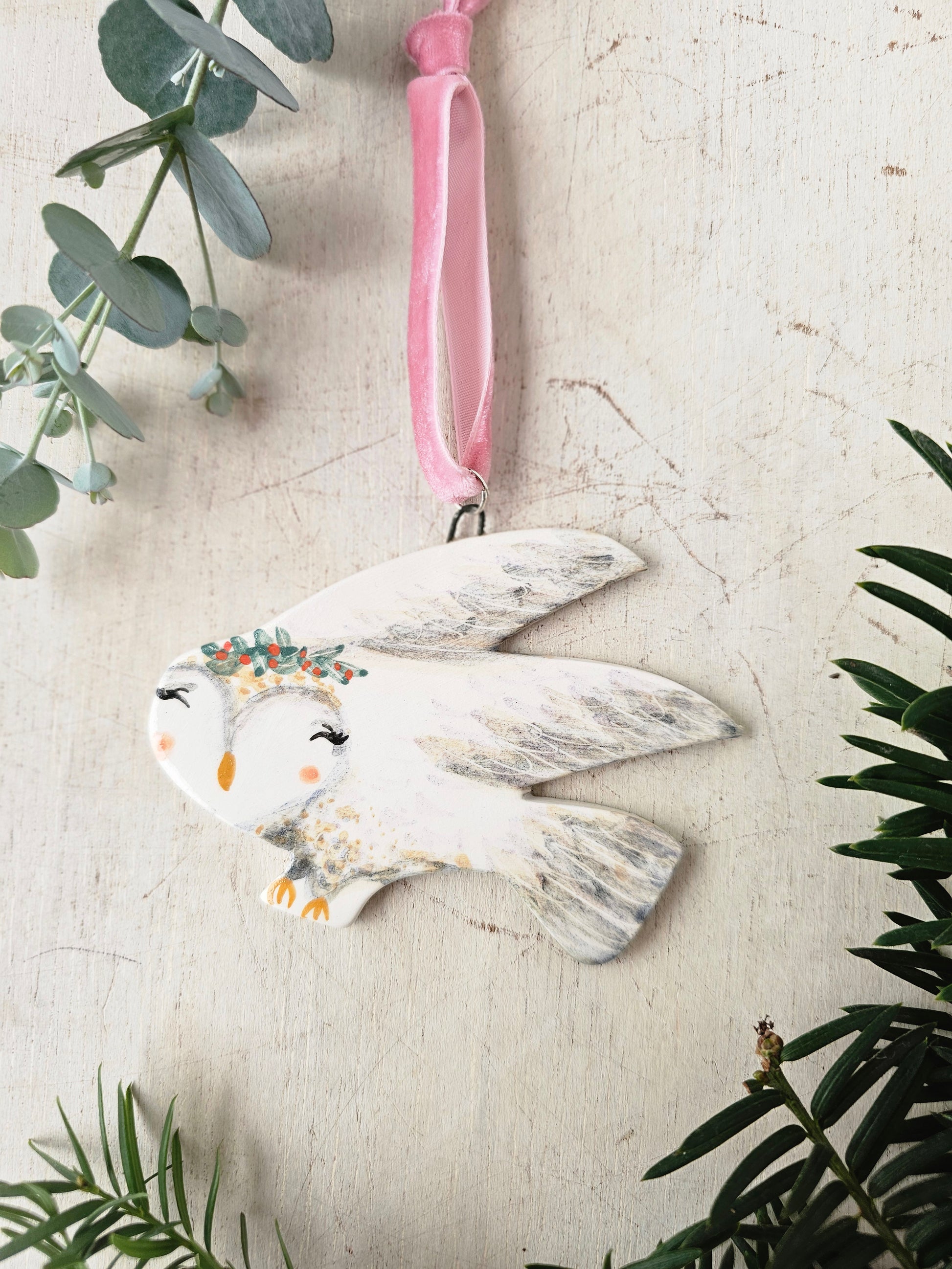 Made to order:Rosa Winterwing — Hand-Painted Ceramic Christmas Snow Owl Ornament